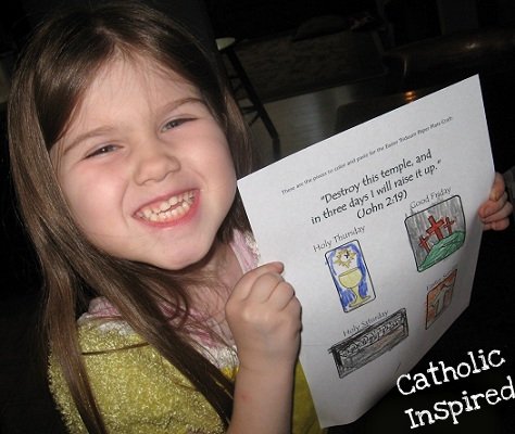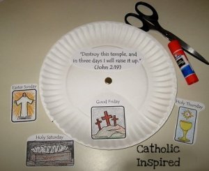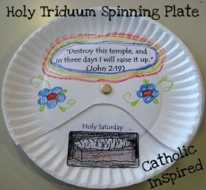 Aquí hi ha una manualitat que vaig pensar i vaig fer amb els meus fills més petits com un projecte ràpid i divertit a la tarda. És una manualitat divertida per explicar el Tríduum Pasqual. El plat gira per revelar els dies del Tridu fins a la Pasqua. També té el verset bíblic de Joan 2:19, on Jesús va parlar de la seva ressurrecció: «Destrueix aquest temple, i en tres dies l’aixecaré». (Joan 02:19)
